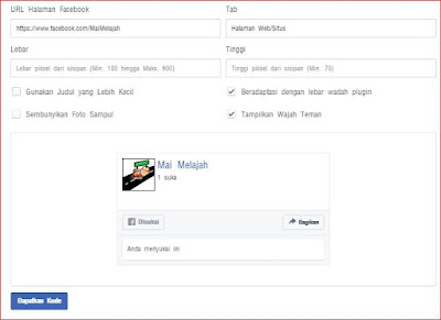 - Di halaman ini kamu dapat mensetting tampilan dari widget Fanspage kamu. Isikan URL Halaman Facebook kamu, dan atur Lebar dan Tinggi widget. Kalo sudah klik tombol Dapatkan Kode.
